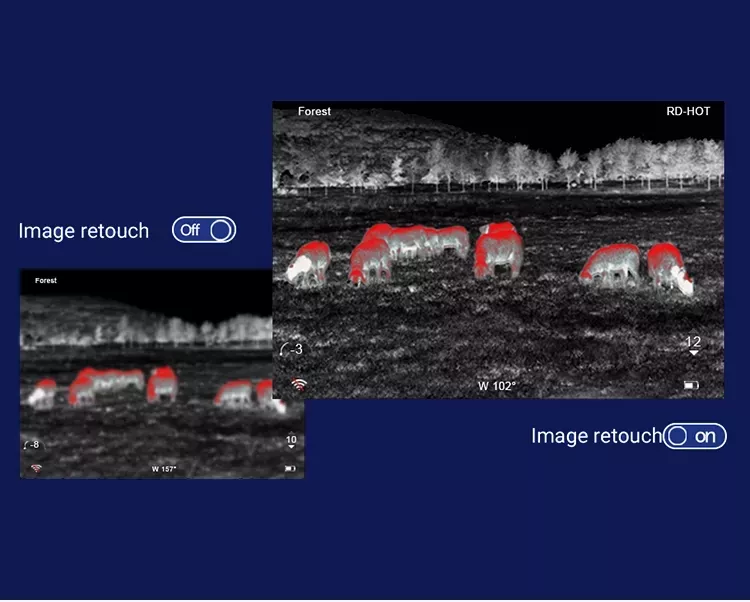 Kamera termowizyjna Helion 2 Pro zapewnia ostre obrazy o wysokim kontraście, które precyzyjnie odzwierciedlają kontury i wyświetlają informacje o najmniejszych obiektach i obszarach przy minimalnych różnicach temperatur. Myśliwi mogą wyraźnie identyfikować cele i obiekty w tle oraz dokładnie oceniać trofea.
